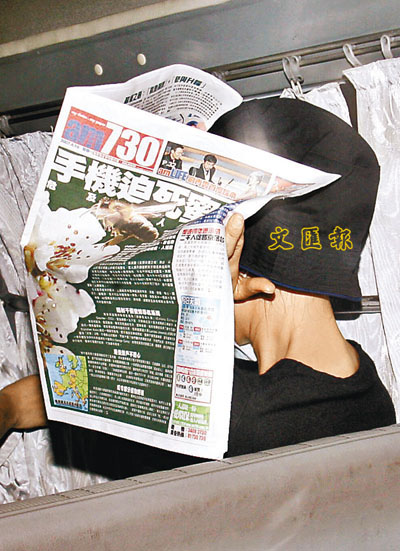 ■李寶玲頭戴漁夫帽、以報紙掩面離開法院。本報記者彭子文 攝