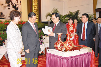 ■中共河南省委書記徐光春(右二)向連戰贈送禮品,右一為河南省省長李成玉。攝影 朱利