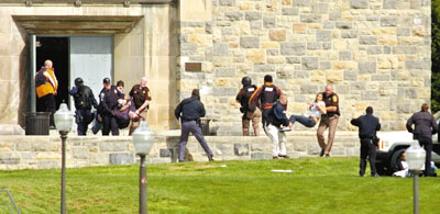 根據美國有線電視網(CNN)的現場畫面,弗吉尼亞科大正飄著雪,時有陣風,多輛警車與武裝警察在校園中搜尋待命,學生則疏離至安全地點。CNN也拍攝到槍案發生時從樓內傳出的槍響。