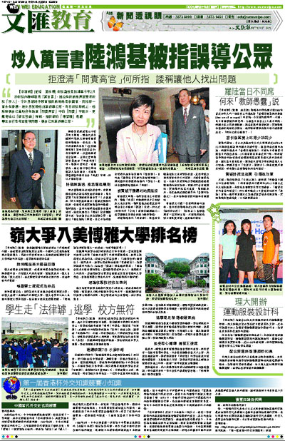 【本報訊】(記者 夏志禮) 教院副校長陸鴻基今年2月於教院內聯網發表「萬言書」,指控有教統局高官要求教院「炒人」,令外界都將矛頭直指教統局局長李國章,而陸卻一直未有澄清,被外界質疑他刻意誤導公眾。昨日教院聆訊上,他除辯稱自己當時沒有為意「問責高官」中的「問責」字眼外,更離奇地以「師生怪論」辯解,指教師的「壞習慣」是讓學生自行思考並發現問題,稱自己無意誤導公眾。