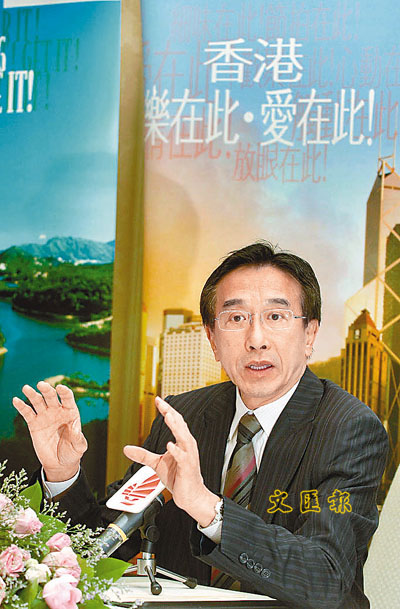 ■旅發局主席田北俊昨日在中環麗嘉酒店與傳媒會面。 本報記者李志樑 攝