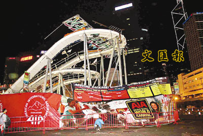 ■中環昨颳起的陣風,將嘉年華一個巨型招牌吹塌。 本報記者鄺福強 攝