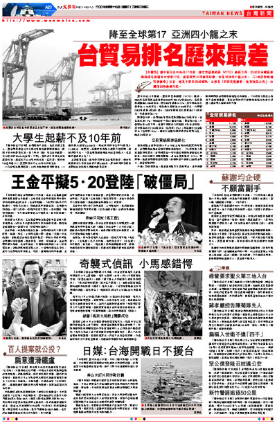 【本報訊】據中新社及中央社17日電:據世界貿易組織(WTO)最新公佈,2006年台灣貿易總額排名滑落至全球第17名,創有統計以來最差紀錄,也是亞洲四小龍之末。「行政院經濟建設委員會」分析,這是不容忽視的警訊,主要是「前有先進國家、後有後起之秀」,台灣須加強產業升級。