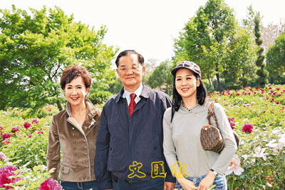 ■連戰一家在洛陽牡丹叢前合影留念,左為夫人連方瑀,右為女兒連蕙心。本報記者陳融雪 攝