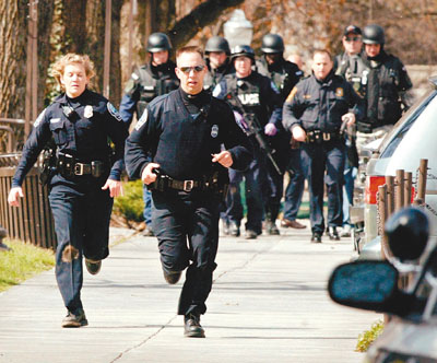 ■布萊克斯堡大批警員,荷槍實彈增援慘案現場。 美聯社