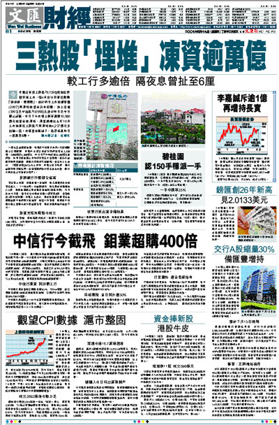 今年雖沒有如工商銀行(1398)般的巨無霸來港上市,但4月份以來新股熱潮「浪疊浪、隻隻熱」,由於明日上市的碧桂園(2007)所凍結的資金尚未回籠,加上洛鉬(3993)及中信銀行(0998)先後於昨日及今日截止認購,今日下午市場上料有高達10,560億元的資金被凍結,凍資規模比去年10月上市的新股工商銀行所凍結的4,237億元多出逾一倍。市場資金緊絀下,隔夜拆息昨日一度高見6厘。 ■本報記者:黃幗兒