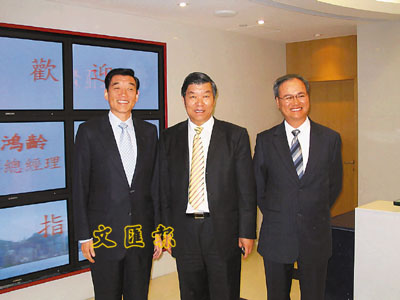 ■范鴻齡(左)到訪本報,受到本報總經理仇學忠(中)熱情歡迎。本報記者卓建安 攝