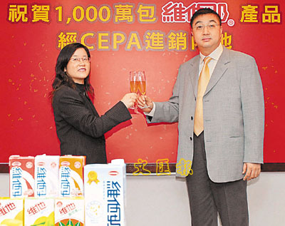 維他奶國際集團出口業務經理伍思梅(左)和維他奶(中國)投資公司董事總經理袁杰在慶祝活動上,共同慶賀逾1,000萬包維他奶產品經更緊密經貿關係安排在中國內地推出。