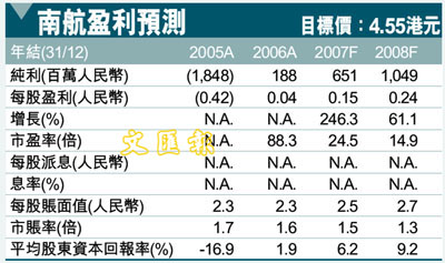 我們下調07年盈利預測39%至6.51億元人民幣(由10.72億元人民幣),以反映復甦程度低於預期,但維持目標價4.55港元(昨收3.7)及重申「買入」評級。我們的目標價是基於1.6倍的08年預期市賬率,我們認為對周期性的行業而言,運用市賬率估值法是恰當的。但是,我們必須重申航空行業本身的風險頗高。風險包括航油價格漲幅高於預期、行業運力增幅高於預期使客座率及整體票價大幅下跌、流行疾病例如禽流感或SARS的爆發。