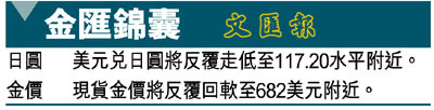 周二紐約商品期貨交易所6月期金收報692.50美元,較上日下跌2美元。由於現貨金價於本周已連番在690美元水平附近遇到獲利沽壓,因此現貨金價於周三時段已一度回軟至685美元附近,預料在獲利沽金盤將會進一步湧現之下,現貨金價將會反覆回軟至682美元附近。