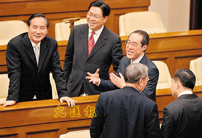 ■在財政預算案通過後,各人紛紛上前恭喜唐司長,而唐英年招牌笑容一直掛在臉上。本報記者李志樑 攝