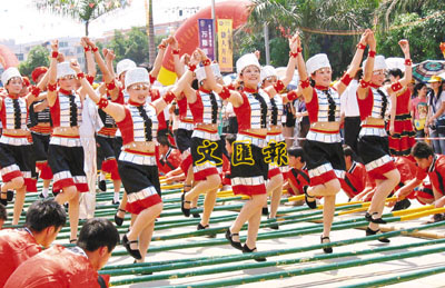 19日是農曆「三月三」,廣西壯族各地民眾舉行各種活動歡慶節日。歌仙劉三姐的故鄉柳州,舉辦「三月三」山歌大擂台,來自廣西各地13名歌王在魚峰歌仙廣場對歌會友,吸引無數市民前來觀看。而武鳴縣舉辦歌墟活動,壯族及各族群眾身著做工精緻、鮮艷奪目的服裝,匯集廣場表演傳統節目歡度節日。圖為民眾在表演「千人竹杠陣」。 中新社