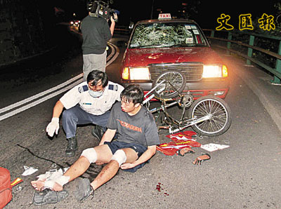兩名分別姓馮(19歲)及姓羅(16歲)的青年,昨晚8時23分踩單車沿灣仔司徒拔道落斜,途至大坑道附近的高架橋彎位時避車越線,遭一輛劉姓(48歲)男司機駕駛之的士撞倒,兩人拋上擋風玻璃後反彈墮地受傷須送院。本報記者溫瑞麟 攝