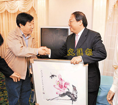 ■香港民政事務局局長何志平(右)接受團長劉大為代表全團贈送的書畫。