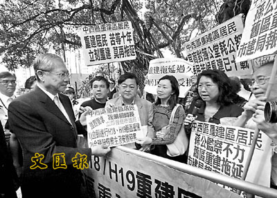 【本報訊】近20名中西區居民昨日趁房屋及規劃地政局局長孫明揚及市區重建局主席鄭維新,出席樓宇復修新里程典禮時請願,要求當局加快重建前土地發展公司遺留下來的「H18(卑利街/嘉咸街)」及「H19(士丹頓街/永利街)」兩個舊區重建項目,改善居民的住屋環境。