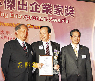 ■吳瑞林(中)喜獲成思危副委員長、潘宗光校長頒獎。