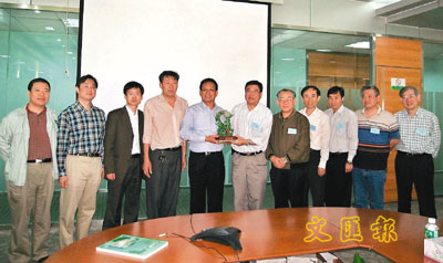 ■李賢義主席(左五)等信義高層,致送紀念品予福建商會考察團。本報記者鄭 群 攝