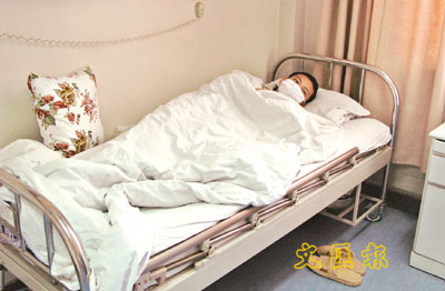 ■河南的一對患病父子,為讓兒子得到6萬元捐款作診治之用,慈父甘願捨棄生命。圖為壯壯正在病床上休息。本報北京傳真
