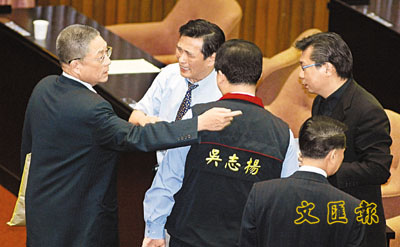 【本報訊】綜合東森新聞及中廣新聞20日消息:台灣立法院20日上午排定處理「排馬條款」,即「一審判決有罪,不能選總統」,由於事關前國民黨主席馬英九角逐08資格,朝野均甲級動員,原本聲言暗助民進黨,令條例過關的親民黨,關鍵時刻重新聯合國民黨,提出散會動議阻擋「排馬條款」。對此,國民黨感謝親民黨協助,也承諾在兩周內會與親民黨協商立委選舉的提名事宜。