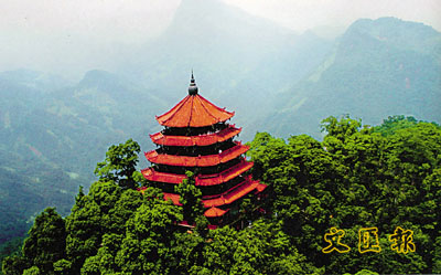 老君閣雄踞青城山第一峰之巔。閣高33米,共六層,下方上圓,層有八角,象徵天圓地方,太極八卦。外觀呈塔形,尖頂,中堆三圓寶,寓天、地、人三才。閣中空,莊嚴矗立太上老君騎青牛巨像,像高13.6米,連牛身通高16米,閣外露天台封基,用石材依勢而建,海漫欄檻,曲折迂迴,盤旋而上至閣頂。晴霽可眺覽岷邛青峨遠近數百里風光及天府平川數百里秀色,可謂集天下之壯觀也。