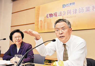 王勝明又說,中央政府正在研究為《物權法》制訂統一的登記制度,但他強調,有關登記制度不會照搬外國的制度,預計會以行政法規形式落實。此外,他又向到場人士講解了「物權法定」及「物權公示」等與《物權法》有關的法律專業問題。