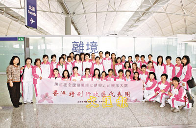 ■香港代表團出發參加全國婦女健身活動大賽前在機場留影。 本報記者梁祖彝 攝