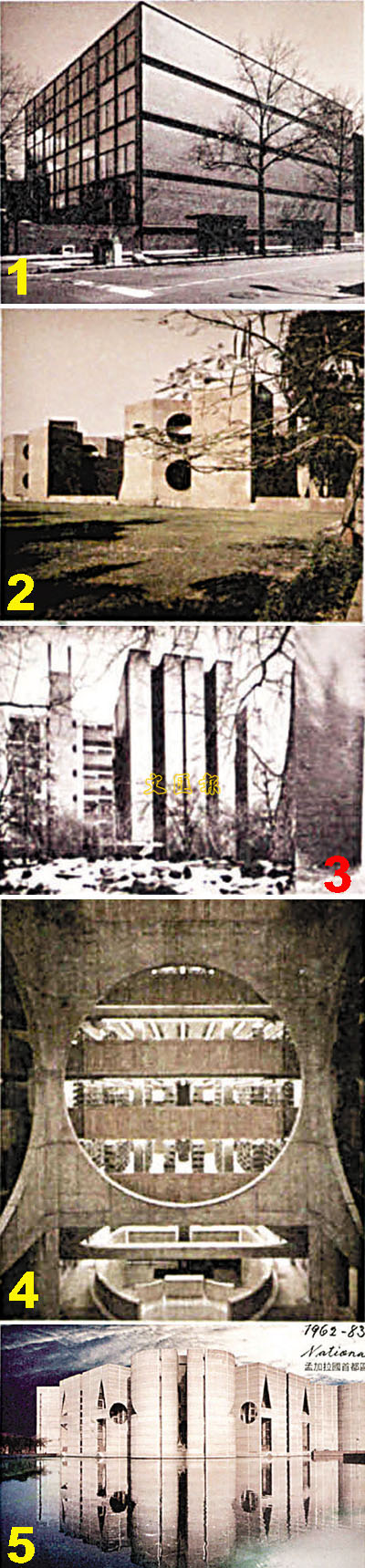 ■(1)美國耶魯大學美術館。(2)印度商業管理研究所。(3)理察氏醫學研究院大樓。(4)愛塞特圖書館。(5)孟加拉國首都區。