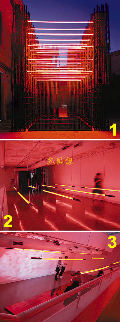 據林偉而介紹,該作品前身「竹梯」在威尼斯展出時,由於展於戶外空間,型態有所不同。當時的展品,五百張竹梯用傳統的手結技術搭建在一起(讓人不禁想起香港獨有的竹棚搭建技術),形成一個半開放的四方空間。交錯的三十支霓虹光管將兩側的竹梯連接起來,地面則放置紅色鏡面,將作品的光影形象倒影而出(見圖1)。