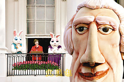 美國第一夫人勞拉布什,在白宮南面的樓台前朗讀復活蛋節的感想。不說你不知,原來這個復活蛋儀式早在1878年由當其時總統凱斯發起的,源遠悠久。但不知為什麼,要放上這個超大的佐治華盛頓巨像在草坪上。還有那兩個陪襯的復活賓尼兔,絕對搞鬼。