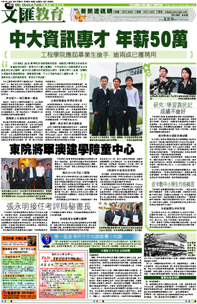根據中大工程學院06年畢業生問卷調查顯示,逾九成學生在暑假完結前已找到工作,當中約四成更早於畢業前已找到。逾半學生月薪高於12,000元,較前年10,000元增加兩成。至於今年畢業的學生,初步調查發現,已有二成學生獲得聘書,當中4至5名學生年薪接近50萬元。