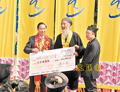 ■李兆基在典禮現場再為樓觀台捐款50萬元,中國道教協會會長任法融(中)預言,四叔能活到120歲。本報記者段維 攝
