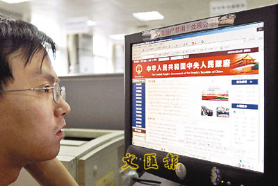 ■一名白領在辦公室內瀏覽中國政府網站。「中華人民共和國中央人民政府門戶網站」於05年10月1日試開通,網址是www.gov.cn。資料圖片