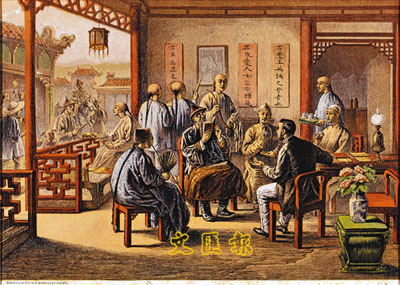 This lithograph was published by the London Missionary Society. A missionary with his back facing the viewer seems to be explaining the Bible to a few Chinese. An old man in official clothes and hat, wearing spectacles is reading the Bible attentively. On the wall, the portrait of the Queen Victoria attracts the attention of other people of the group. From this picture, we can see the activities of foreign missionaries in Guangzhou in the mid-nineteenth century.