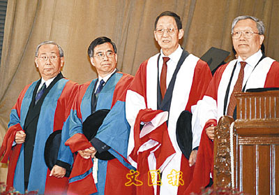 ■(左起)許仕仁、陳思堂、崔琦及路甬祥獲港大頒授名譽博士學位。