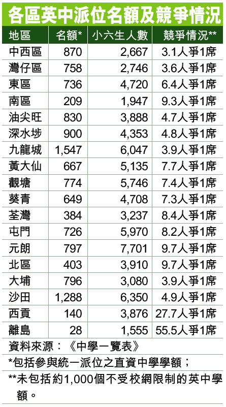 各區英中派位名額及競爭情況