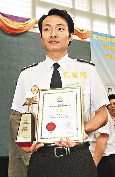 西九龍總區去年發生的爆竊案較03年大幅下跌36.1%,西九龍警區指揮官盧奕基表示,區內物業及停車場保安員是居功厥偉,故舉辦「西九龍最佳保安服務選舉」以作表揚。被評審團認為是「有勇有謀」的典範的金獎得主馬志亮,在屋苑閉路電視中,認出疑匪,機智地先安排同僚鎖住出入口,再與警方合作追捕疑人,令匪徒當場人贓並獲。本報記者梁祖彝 攝