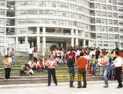 ■鹽田一間港資廠的工人,因不滿資方更改底薪合約,在工廠的門前靜坐抗議。 本報深圳辦傳真
