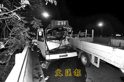 【本報訊】荔枝角呈祥道昨晚發生車禍,一輛滿載乘客公共小巴沿呈祥道往葵涌,下斜時不察右彎位停有一輛俗稱「箭嘴車」的道路工程車,收掣不及從後猛撞,共有15人浴血,包括小巴女司機及乘客。