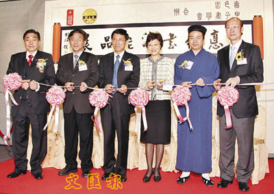 ■左起:李耀輝、王永樂、蔣堅永、陳甘美華、黃信陽和蘇樹輝主持《道德經》書法展剪綵儀式。