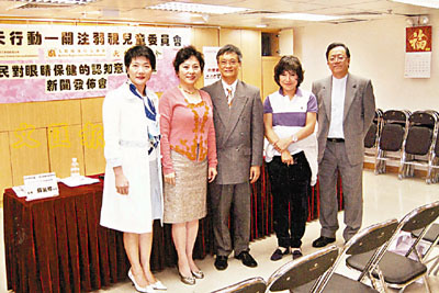 ■(左起)蘇麗珍、馮丹藜、陳志榮、鮑幗潔及黃德倫在「市民對眼睛保健的認知意見調查」新聞發佈會(3月23日)上合照。