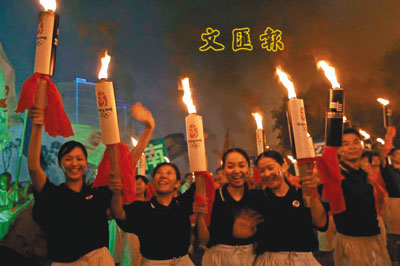 ■三亞市民慶祝該市成為首傳城市。本報三亞傳真