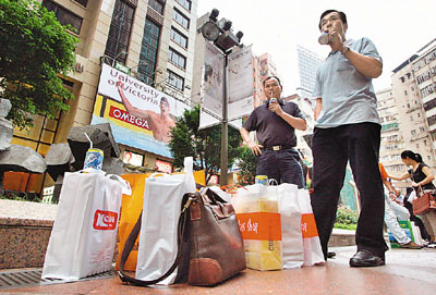 另外,早前傳出內地旅客在港購得冒牌貨,林振名透露,西九龍區自4月6日至今,已先後收到48宗內地旅客的求助,當中5宗已證實旅客所購買的為假冒貨品,警方已轉介至海關接手處理,餘下的求助者多不滿購買的貨品質素差劣,又或是售價過高,有關個案則已轉介至消委會跟進。由於五.一黃金周即將展開,林振名提醒內地旅客,在港購物應到售賣正版正貨及貼有旅發局優質標誌的商店購物,警方今天起亦將一連8日在九龍城等定點購物商店熱點、火車站及地鐵站向旅客派發傳單以提醒旅客。