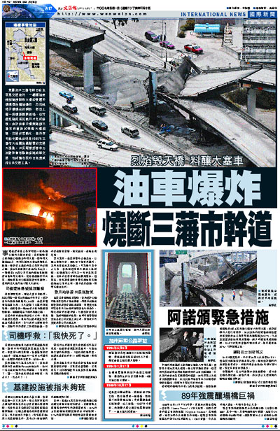 美國加州三藩市前日發生罕見交通意外,一輛運油車撞倒連接跨海大橋的雙層天橋橋躉後漏油爆炸,烈焰燒熔天橋橋柱的鋼筋,導致上層一段橋面斷開倒塌,估計損毀路段須花數月才完成修復。由於出事天橋與連接三藩市和屋崙的海灣大橋相連,交通非常繁忙,意外有可能令當地出現自1989年三藩市大地震後最嚴重的交通大混亂。州長阿諾舒華辛力加隨即宣布緊急措施疏導交通,包括讓市民昨日免費乘搭公共交通工具。