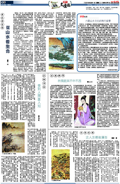 更多的人,是再次反身投入於永恆的自然山水中,親山愛水,在與自然山水的冥會神契中消解感傷,完成對生命體認的昇華。如《世說新語.言語》載王胡之遊印渚之語:「王司州至吳興印渚中看,嘆曰:『非唯使人情開滌,亦覺日月清朗。』」王胡之所言「使人情開滌,亦覺日月清朗」,即是在賞山怡水中體悟生命的歡娛。