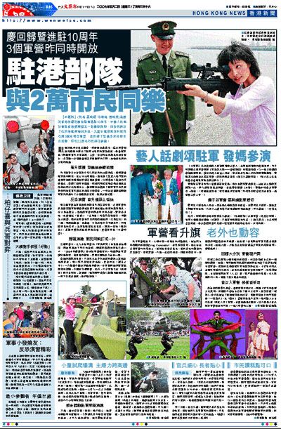 昨日儘管天文台錄得今年以來最高的30度高溫,但無損香港市民的興致。從上午10時開始,預先領了免費入場門票的香港市民興致勃勃地來到各開放營區,分別參加了莊嚴的升旗儀式;參觀了駐軍的艦艇、飛機和輕武器等裝備及連隊生活設施和文化活動中心;饒有興致地觀看了駐軍官兵的兵器操作和欣賞官兵演出的精彩文藝節目;一些社會團體還與駐軍官兵們進行了文藝聯歡及足球、籃球友誼比賽。