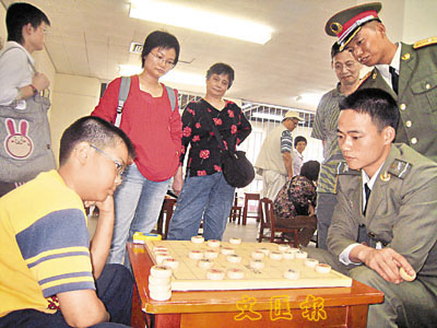 ■梅賢柏(左)與駐軍聚精會神在棋盤上較量。本報記者郭曉樂 攝