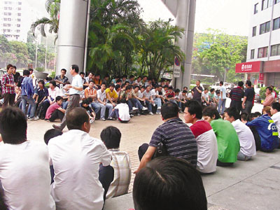 ■為了追討加班費,大批工人在赤灣港貨櫃碼頭有限公司總部赤灣石油大廈門口靜坐。本報深圳傳真