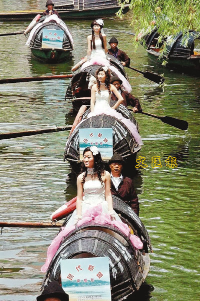 2日,婚紗模特在浙江紹興坐著當地特有的烏篷船演繹時裝秀。紹興是著名的江南水城,五一黃金周期間首次推出時裝婚紗秀坐烏篷表演。中新社