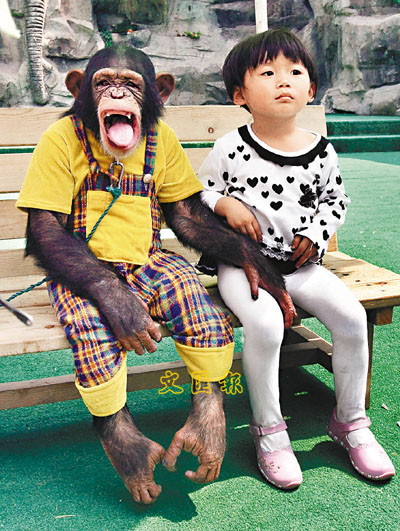 2日,上海野生動物園舉辦「動物秀」慶祝「黃金周」,圖為一名小女孩與黑猩猩親密地並肩而坐。 美聯社