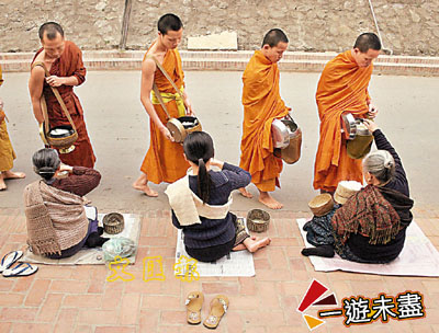 該城2萬多人口中,有200多名和尚。每天清晨沿街化緣是一大景觀,吸引遊客的也正是此。通常,等待佈施的信徒沿街排列,等各個寺廟的和尚十來個排著隊到來時,信徒便把糯米飯、粽子等食物依次獻給和尚們。化緣的和尚排成長長的隊列,黃色的袈裟在太陽的照射下,映照出瑯勃拉邦人對宗教的虔誠。